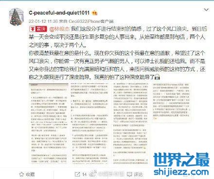 12日,此前多次喊话林俊杰的网友@C-peaceful-and-quiet1011 再次发文,称两人“分手”,表示“你很清楚我最在意的是什么。现在你欠我的这个我最在意的道歉,希望过了这个风口浪尖,你能做一次有真正男子气概的男人,可以绅士礼貌的还给我。”