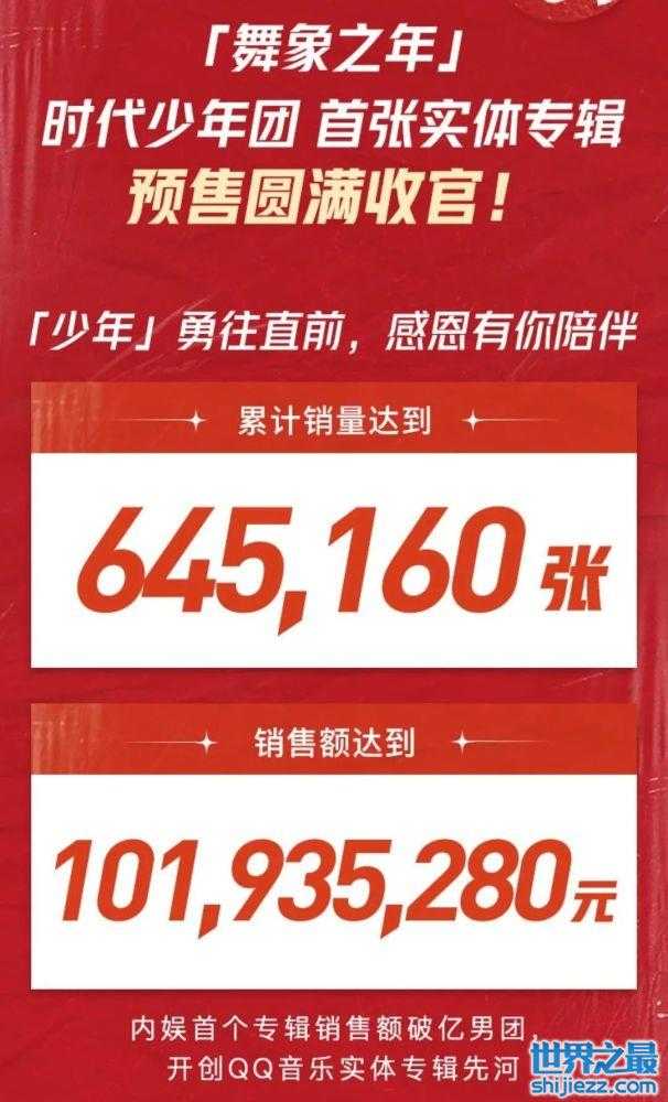 组合的第一张实体专辑《舞象之年》,仅仅用了三天时间,销售额就破亿。成为内娱首个专辑销售额破亿男团,开创QQ音乐实体专辑先河。