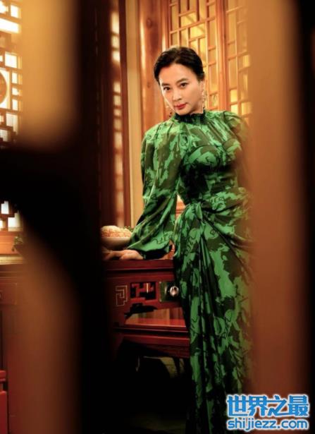 另一组造型中,李玲玉换上一件绿色带着些墨色的公主长裙,款式以及颜色将她衬托得很是美艳,整体看上去,她就是个复古典雅美女。