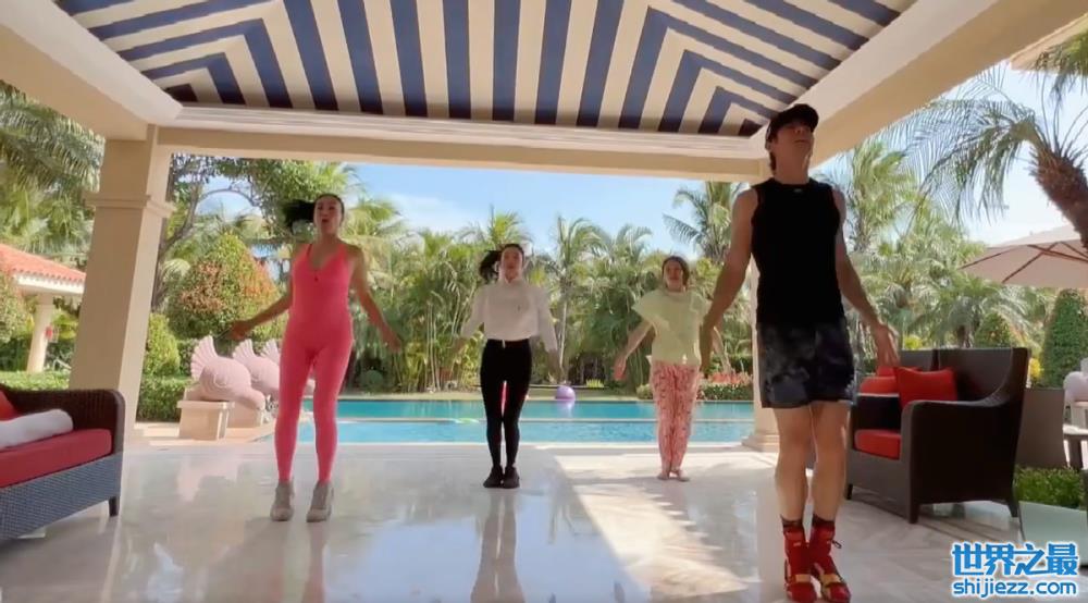 画面中钟丽缇携全家在户外热身运动,一边做高强度的有氧运动,一边喊出口号称势必要练出马甲线。最吸睛的是钟丽缇穿着荧光粉的紧身衣,疯狂跳动燃烧脂肪。