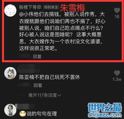 就在这条视频下面,大衣哥唯一的女儿朱雪梅发声了,替妈妈澄清说:小伟他们去捐钱,却被别人说成是作秀,大衣嫂就说不要捐了,好心还被别人说,咱们自己吃,自己喝不行吗?好心被别人说图啥呢?大概就是这个意思,大衣嫂作为一个农村没文化的婆婆,这样说很正常吧。