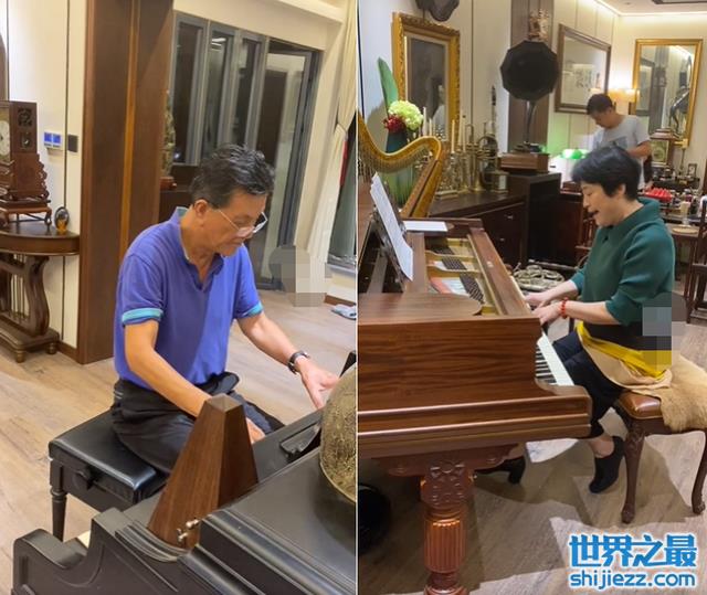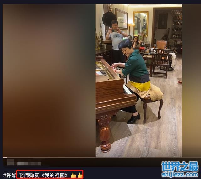 许娣旁边还有一位老先生,他在一旁很是认真的弹奏着,弹得很是厉害且专业。老先生一曲弹完转身与许娣相视一笑,许娣看到后便抚摸一遍键盘,开始自弹自唱《我的祖国》。许娣完全沉浸在曲子中闭着眼睛表情十分陶醉。