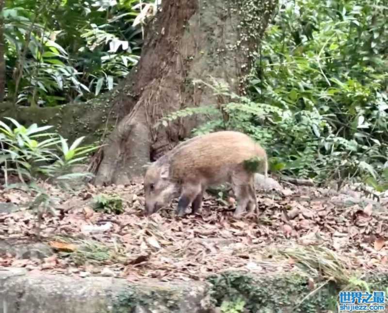 一组照片中还有在爬山的过程中遇见野猪的照片,满是丛林大树的环境中只见一只棕色花色的小野猪低头闻地上的树叶里似乎在寻找食物。
