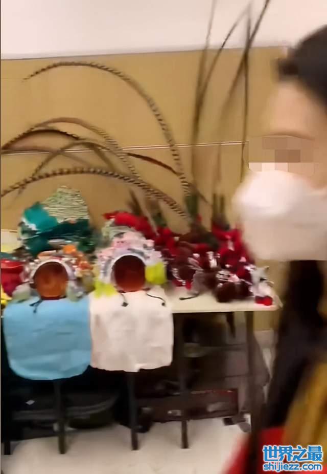 视频中,春晚的后台桌子上面摆了很多道具,其中特别漂亮的是戏剧帽子,唱戏的帽子很多不同颜色、款式,看来准备的很是丰富。