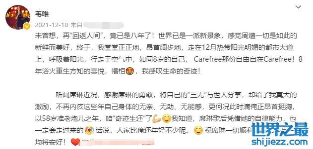 韦唯自己也晒出了视频动态,并在配文中写道:再次返回人间已是八年,外面已是一翻新的景象,感觉一切都变得那么美好。通过这一番言论,就有网友猜测韦唯休息的这几年很可能是养病去了。