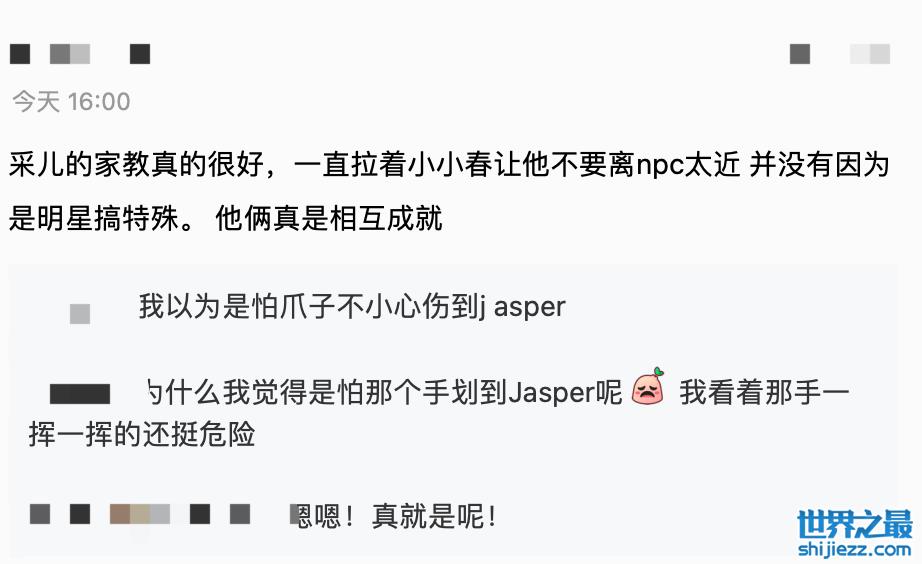 对此,有不少网友们评论道“采儿的家教真的很好,一直拉着小小春让他不要离npc太近,并没有因为是明星搞特殊”,“我以为是怕爪子不小心伤到jasper呢”“我看着那手挥一挥的还挺危险”,看起来大家都对应采儿对jasper的教育十分关心。