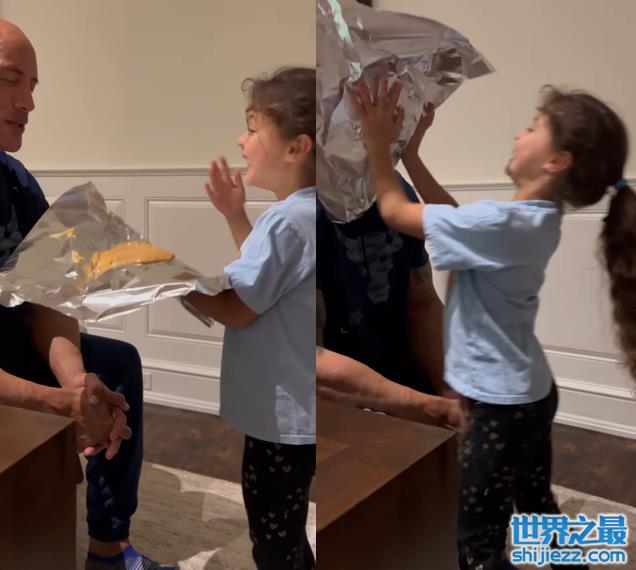 但即使这样悬殊的体型,也并不影响女儿对于爸爸强森的喜爱,准备好后直接扶着花生酱,一巴掌“呼”在了老爸脸上,一点都没手下留情,而银幕硬汉巨石强森却被糊了一脸花生酱,毫无反抗的手段。