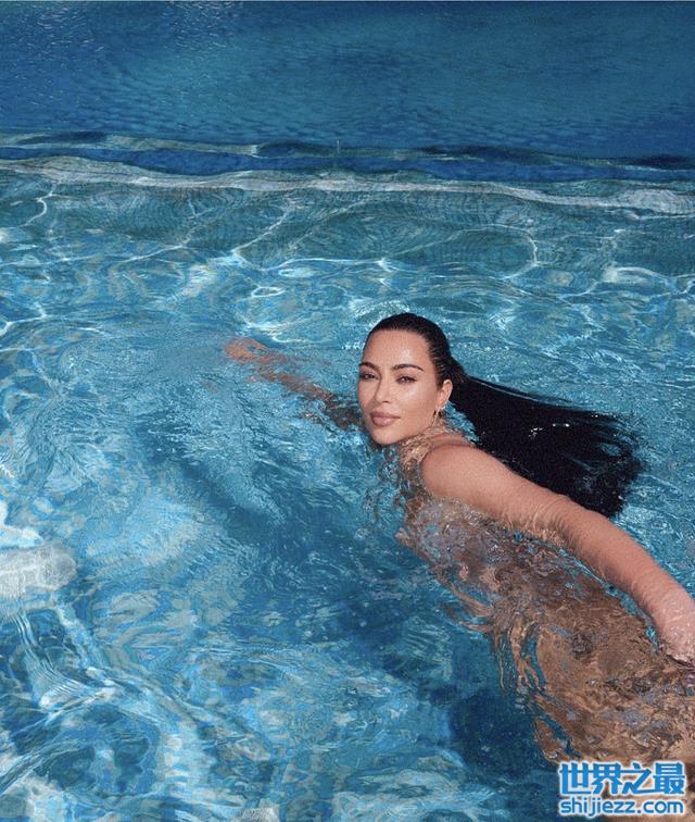 金卡戴珊正在泳池中畅游,她扎着很是简单干净的马尾,一脸开心地游着。金卡戴珊游着自由泳,她的动作姿势很是专业又标准。