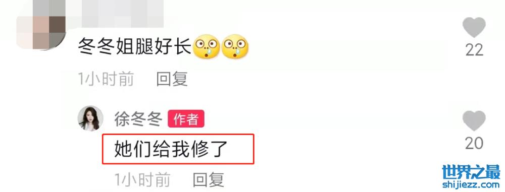 盛装出席的冬冬吸引到网友的目光,有人留言称冬冬腿太长实在好看。徐冬冬不留情面地戳破长腿假象,说这是工作人员努力的成果。