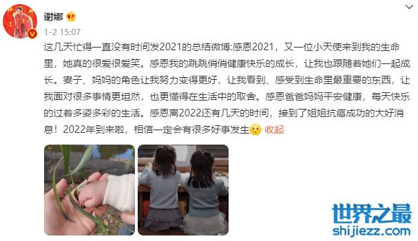谢娜自从有了两个女儿后,经常在社交平台上分享关于两个孩子的日常点滴。2021年结束的时候,谢娜发了一篇总结并晒出来两个女儿的照片。谢娜表达了对女儿的感恩和爱,女儿让作为母亲的她变得更好,对很多事情更加坦然。