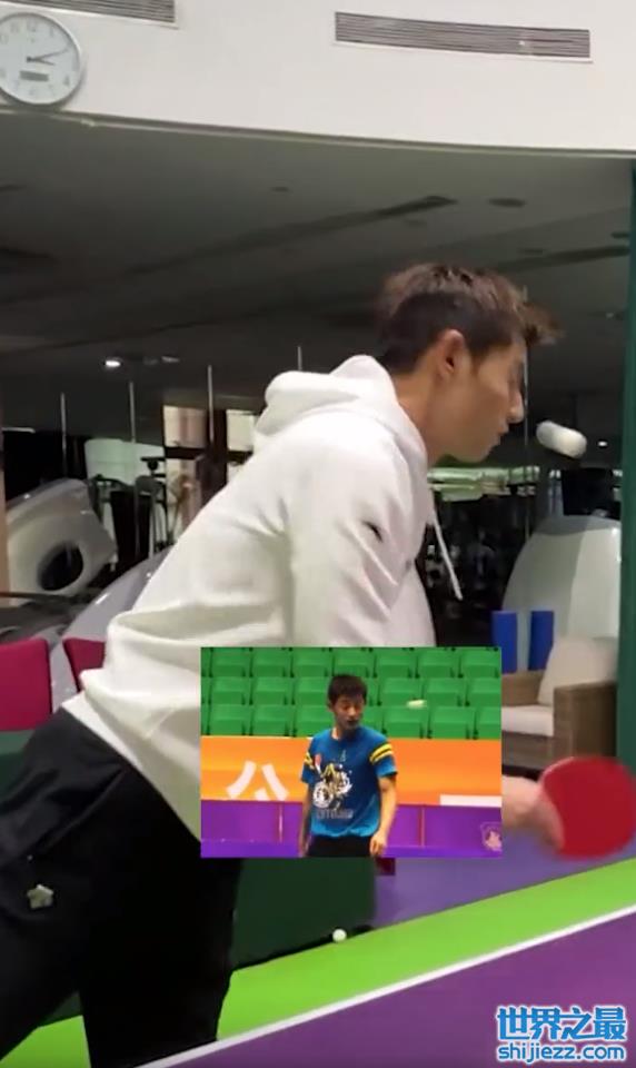 果然不出张继科所料,痞幼一连四个球都没有打中。张继科便拿起拍子给痞幼示范,只见张继科一个球瞬间击中车钥匙,还差点被反弹过来的球打到脸,不过张继科还是非常灵敏地躲过了,不愧是世界冠军的水平。