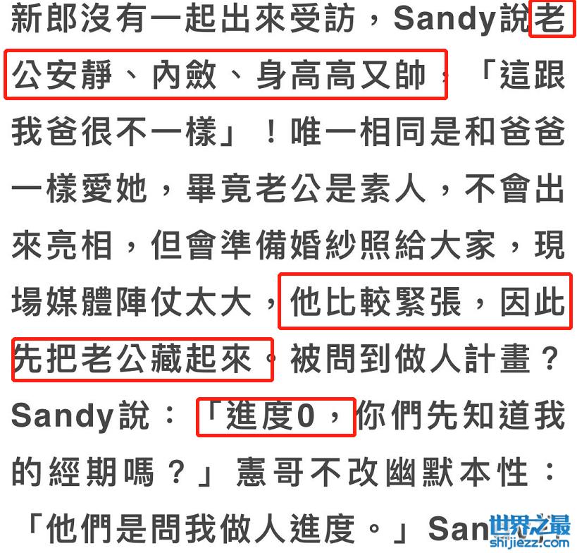 婚宴前夕吴姗儒接受采访时就曾表示“老公性格内敛安静、又高又帅,还和爸爸一样爱她”,而在解释老公未曾露面采访的原因时她也解释道“毕竟老公是素人,现在比较紧张”,对于生子传闻吴姗儒也作出回应,短期内并无计划。