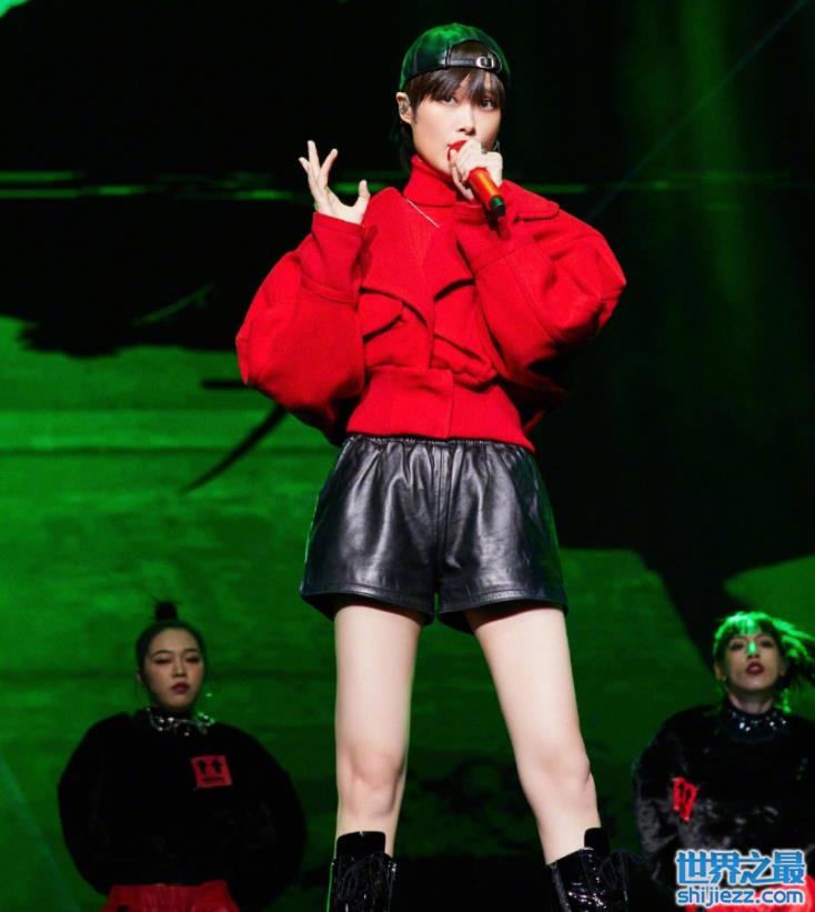 李宇春头戴着黑色鸭舌帽,上身是大红色长袖,下面是黑色短裤,酷炫范十足,衣服色彩的搭配很是冲击感。黑色皮的短裤,将她的双腿显露出来,可见李宇春的身材保持的超级棒。