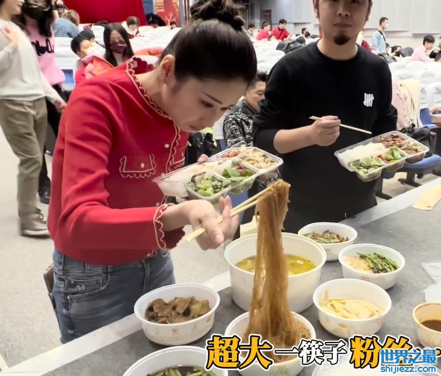 而且颖儿在现场吃的也是相当的开心满足,拿着筷子夹起一大口粉丝时,看起来就像是吃面条一般夸张。