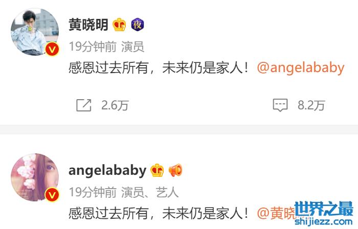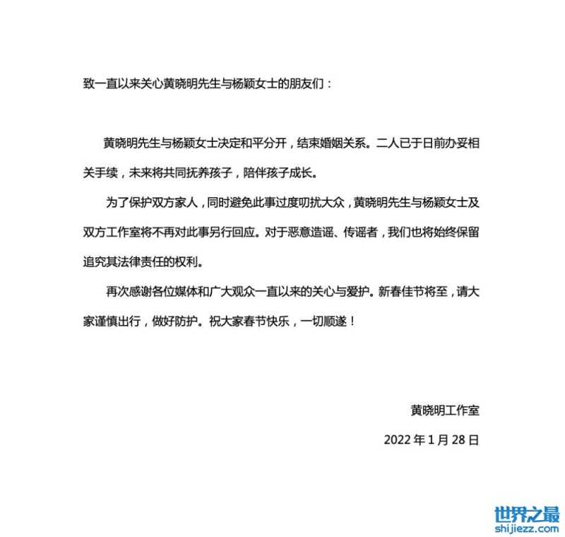 1月28日,黄晓明与Baby猝不及防官宣离婚,两人感恩过去所有,未来仍是家人,双方工作室也同时宣布两人已于日前办妥离婚手续,未来将共同抚养孩子,陪伴孩子成长。