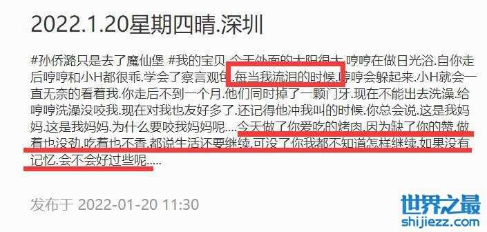 1月20日,孙侨潞妈妈在社交平台写起了日记,她说:“我的宝贝 今天外面的太阳很大……每当我流泪的时候,哼哼会躲起来,小H就会一直无奈地看着我,还记得他冲我叫的时候,你总会说,这是我妈妈,这是我妈妈,为什么要咬我妈妈呢....今天做了你爱吃的烤肉,因为缺了你的赞,做着也没劲,吃着也不香,都说生活还要继续,可没了你我都不知道怎样继续,如果没有记忆,会不会好过些呢.....”