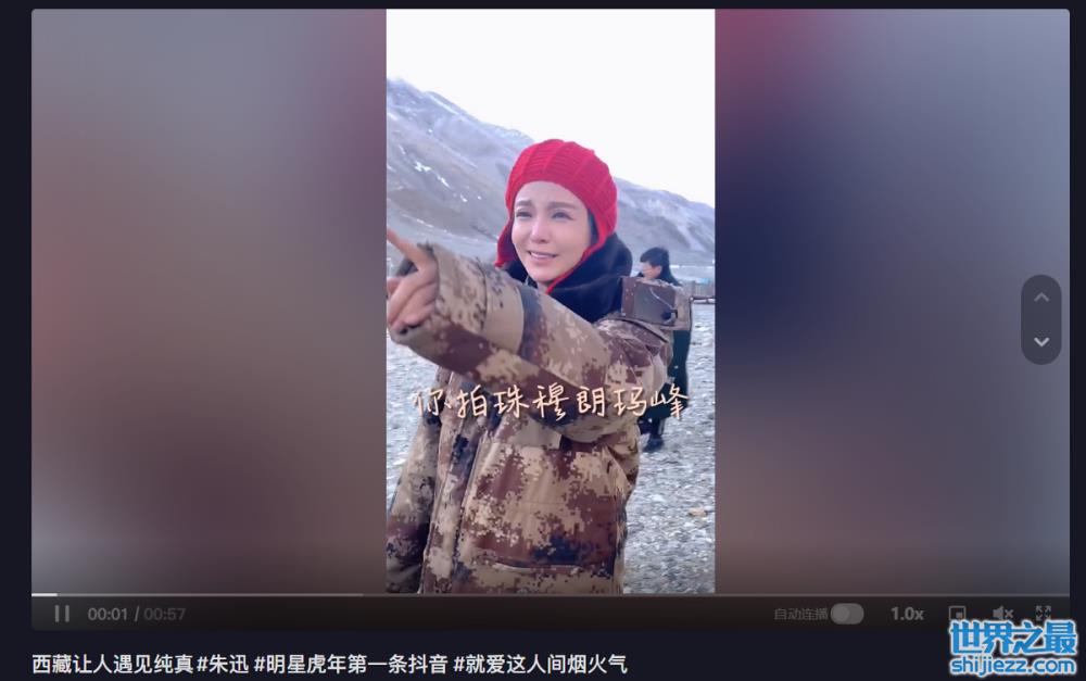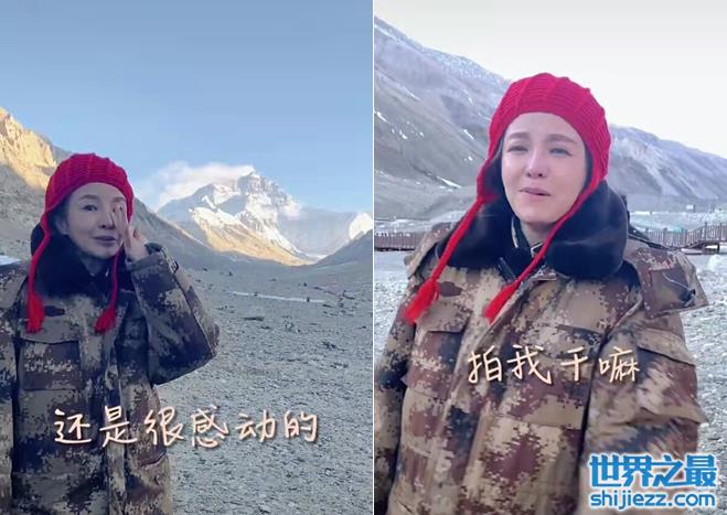 在视频中,朱迅打扮得保暖又接地气。只见她身穿一件厚厚的迷彩外套,头上还戴了顶保暖的红色线帽,可谓是从头武装,在镜头转向朱迅时,只见她泪流满面,正动情地仰望着不远处的珠穆朗玛峰。