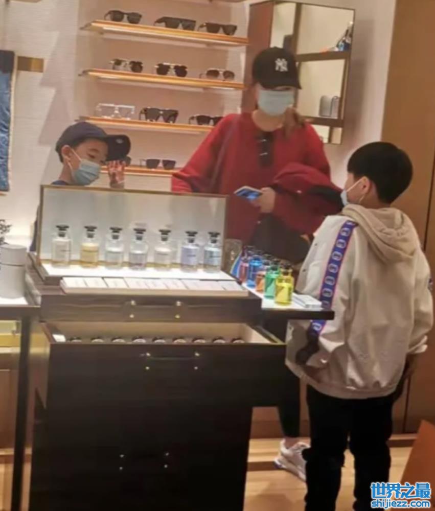 从图中可见,应采儿戴着鸭舌帽,穿着红色上衣非常喜庆, Jasper正在挑礼物,陈小春穿着厚厚的羽绒服,应采儿母子俩还在购物,陈小春提着主动提着买好的商品准备离开。