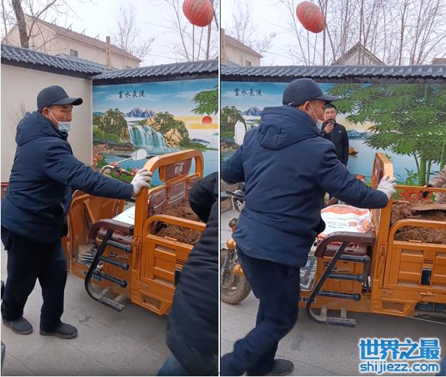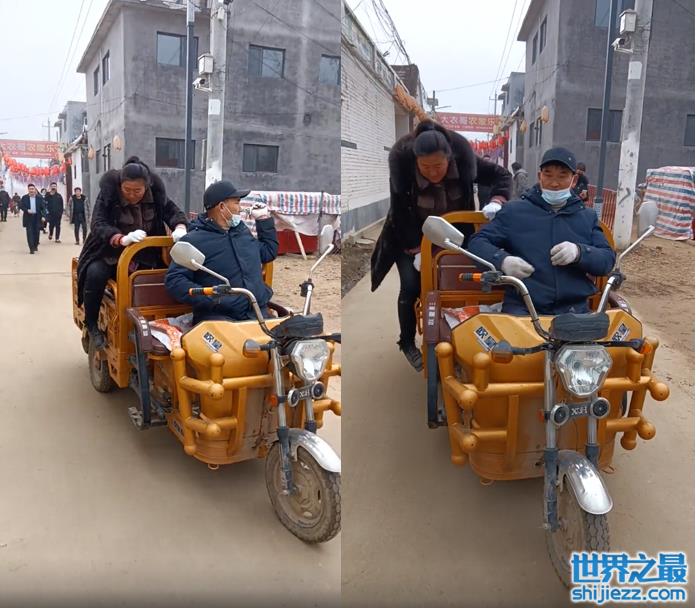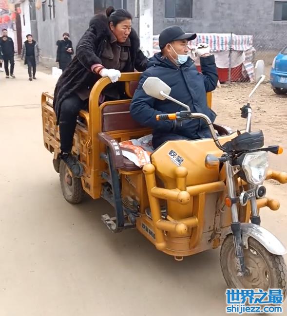 视频中,大衣哥朱之文骑着自家的一辆金色电三轮,正准备上街,而大衣嫂穿着一件棕色仿制皮草,坐在电三轮上,十分接地气。