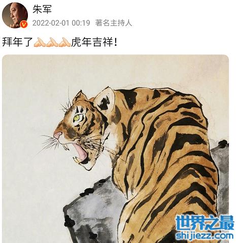 在大年初一的时候,朱军也曾在个人的社交账号上晒出一幅老虎图给大家拜年,虽然与妻子谭梅晒出的这幅画并不相同,但寓意相似,老虎画的生猛有力。评论区也称朱军为全才,并祝其新年快乐。