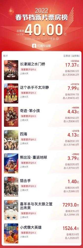 2022春节档总票房破40亿:《水门桥》17亿领跑,《四海》口碑崩盘 ...