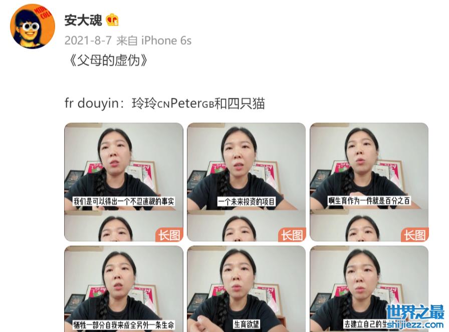 另外,安大魂从没有公开聊过她的家庭,不过从她分享的动态看,她曾发文谈父母的虚伪,认为一个孩子不幸福的根源,是来自父母的生育观,认为孩子也从未有话语权,虽然不知道她的家庭是怎样的,但通过安大魂的这条动态,可以感受到她的生活一直缺少真正的关爱,也或许是她抑郁症的原因之一。