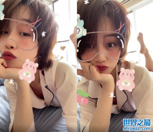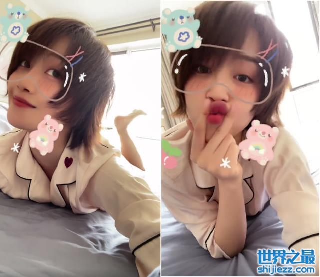 蓝盈莹脸部开着粉色小熊特效,身体跟随着动感的音乐在床上晃动。突然蓝盈莹将脸贴在床上,鼓起嘴巴露出委屈的可爱模样,十分惹人怜爱。随后蓝盈莹又抬起头用力地晃着脑袋,但一头短发丝毫不凌乱。