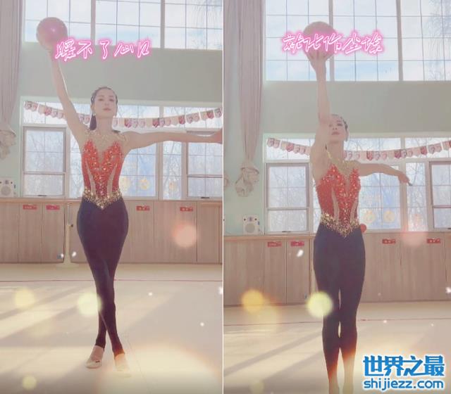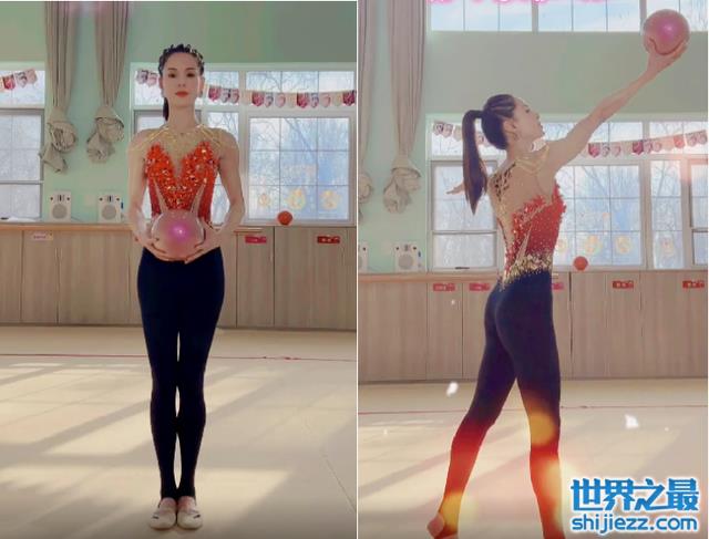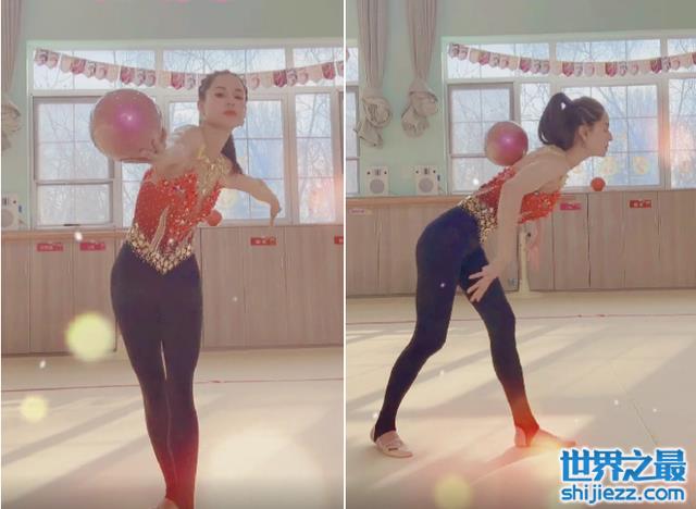 李若彤玩体操球也十分熟练,做起高难度动作也毫不费力。只见她先单手将体操球360度绕身一周,十分灵活。然后她又将体操球放在后背上,体操球顺利地呈直线从后背滚落,李若彤双手绕道后背接住,一套动作行云流水。