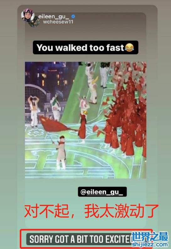 谷爱凌的粉丝发现了她走路太快,险些超过了领队的旗手,随后还直接在社交平台上截取出了她当时的状态。谷爱凌本人看到了之后,也在第一时间回应该网友表示,自己太激动了,所以才会不小心冲出队伍。