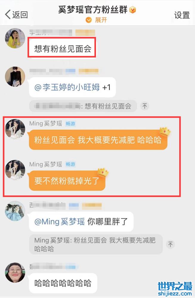 看到奚梦瑶空降群中,粉丝们非常激动,问她什么时候出来营业,会不会举行粉丝见面会?奚梦瑶则回应说,要是举行粉丝见面会,她大概要先减肥,要不然粉丝就掉光了,奚梦瑶幽默的回答逗得粉丝哈哈大笑。