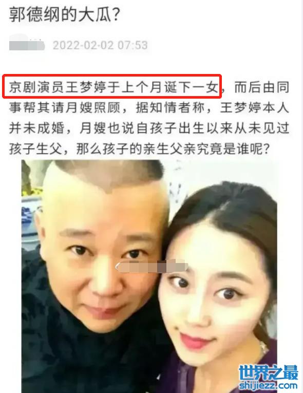 近日,郭德纲被造谣与年轻京剧演员王梦婷私下生女,并且孩子已经一个月大,目前经由月嫂照料,并且该造谣者还配上了郭德纲与王梦婷的亲密合照,似乎在暗示孩子爸爸的身份。但事实上并没有任何实际证据,完全就是一个大谣言。