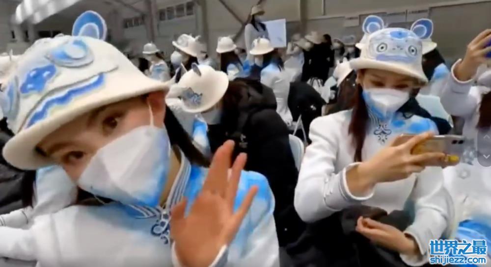 其实这一些举牌引导员都还是在校的大学生们,并且小姐姐们都是志愿者们。当冬季奥运会开幕式快要开始的时候,小姐姐们一个个都穿戴好服装,带着白蓝色调的虎头帽子和礼仪服装在等候室内十分兴奋,大家都很高兴的拿出手机来互相自拍,似乎训练时的疲惫和痛苦都值得。