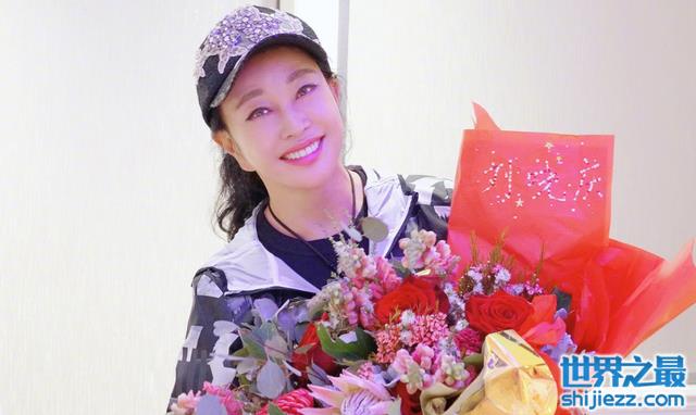 刘晓庆左手捧着一束超大的鲜花,包花的纸上面还印着刘晓庆的名字;右手拿着一个黑色酒瓶,瓶子上还贴着刘晓庆曾经饰演过的武则天的照片,这份礼物可谓十分用心。