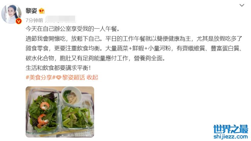 从她晒出的饭菜照来看,黎姿吃的东西的确是有些过于简单了,两大碗生的菜叶子,上面摆着三只水煮的虾,再配上右上角一小口米粉,就已经是全部,对于普通人而言,如此简单清淡,甚至连一点油水都看不到的午餐,属实有些过于健康了。