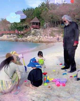 张纪中之前就曾在个人社交平台晒出一家五口去三亚旅游的视频。视频中,杜星霖和几个孩子蹲在沙滩上体验玩沙带来的乐趣,旁边摆满了小朋友们“施工”的器材,张纪中戴着墨镜站在一旁弯腰看着他们,周身满是温馨甜蜜的氛围。