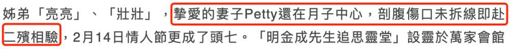 明金成去世前还守护在妻子林沛缔身边,可见作为丈夫和父亲的他对妻儿充满了爱意。据悉,林沛缔是在半夜醒来时发现明金成怎么都唤不醒时紧急叫救护车将他送往医院。遗憾的是,明金成最终抢救无效离开人世,而当时他的双胞胎仅出生19天。