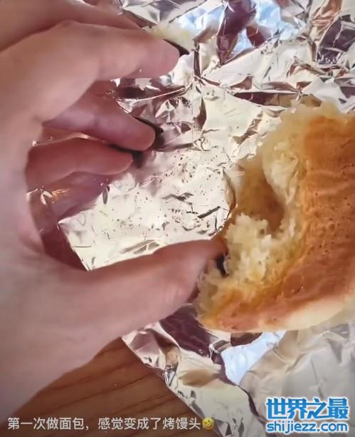 仔细看张馨月烤的面包,感觉整个样子都特别的漂亮,并且并没有烤过头的意思。她还不忘记撕开面包给站在一旁的老公林峰看。
