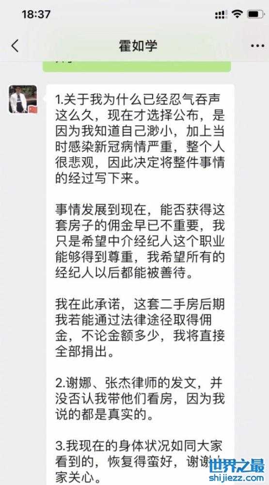 第二点就是为什么自己忍气吞声这么久,现在才选择公布,是因为我知道自己渺小,加上当时感染新冠病情严重,整个人很悲观,因此决定将整件事情的经过写下来。第三点就是霍某再次承诺,这套二手房后期我若能通过法律途径取得佣金,不论金额多少,他将直接全部捐出。