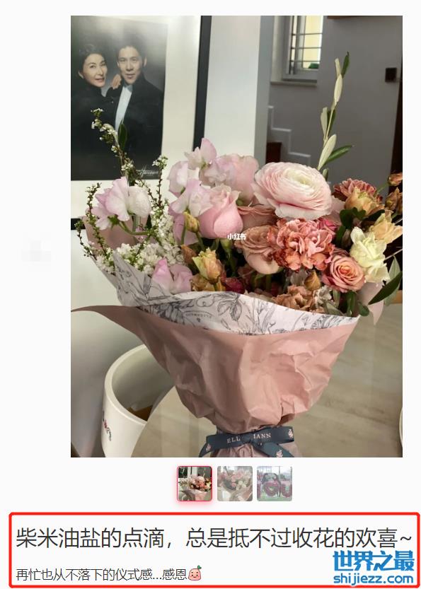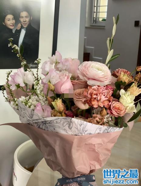 照片中,郭晶晶晒出一张一大捧鲜花的照片,花束包扎的很是少女感,看来霍启刚很是用心。花束的后面摆着一张夫妻俩人的合影,郭晶晶一只手搭在老公肩上面,笑得很是甜蜜,霍启刚站的很直,脸上也是洋溢着幸福的微笑。