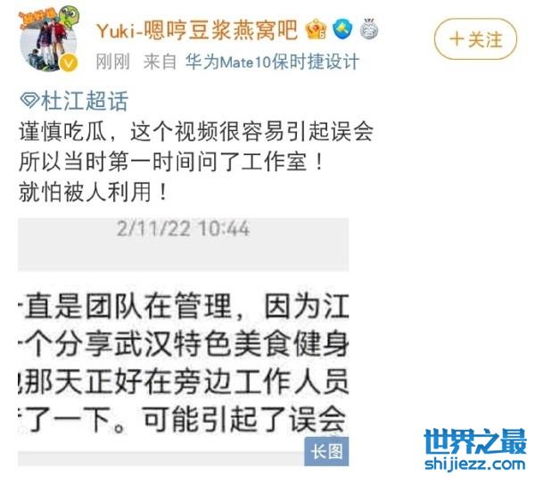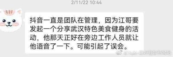 但据熟悉杜江工作室的粉丝称,2月11日自己就已经问了杜江团队,团队称杜江是要发起一个武汉美食健身的活动,私信也是工作人员发的。同在2月11日,杜江的某平台账号内容显示:“请把武汉好吃好玩和健身的地方发给我吧!”