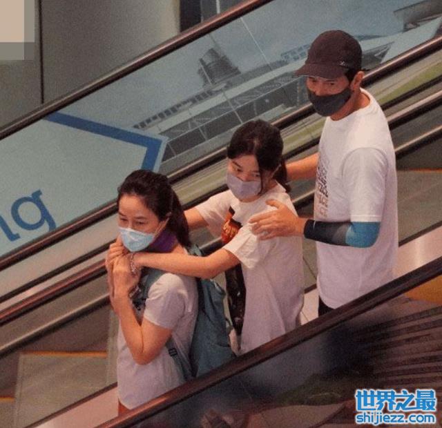 吃完饭后,一家人乘坐电梯下楼,张家辉站在后面,双手搭着女儿的手臂,很是宠溺的样子。女儿也是环抱着妈妈的脖子,关咏荷温柔地回应她,一家人的氛围很是温馨。