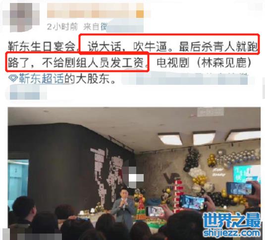 事情是前几日,有管群演的大号在社交平台上公然怒斥靳东,还配上一段靳东生日宴会的视频,说靳东喜欢说大话,吹牛,杀青后直接跑了,工资也不发。然后这个大号有发文,说靳东现在投资的这部剧有两个亿,但是因为不给工资,就导致300个人的一个月工资没有到手,很多人连租房都很困难。