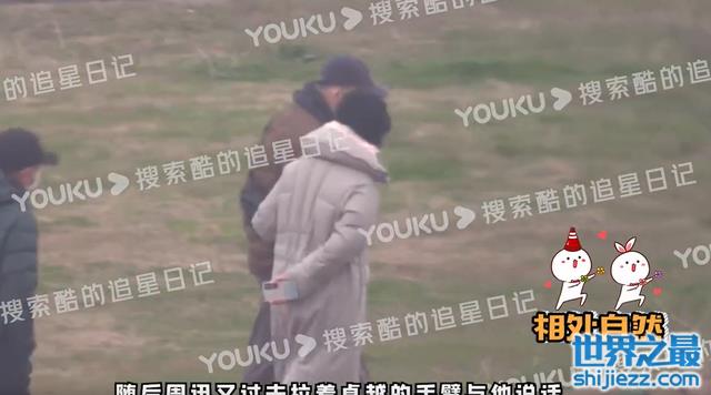 周迅换上一件灰色羽绒服,双手背在身后与爸爸热聊,周迅妈妈走在最前面看手机,卓越走在最后面看手机。因为一些原因,几个人便原路返回了。