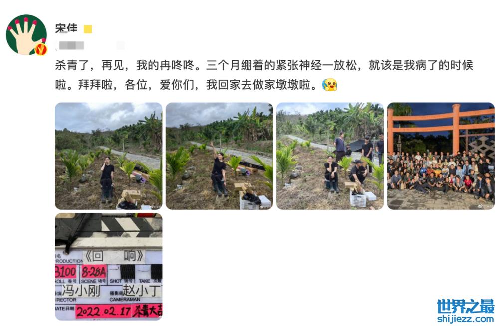 除此之外,宋佳乖巧地坐在一旁,而另一旁全是辛苦作业的工作人员们,看起来杀青之后大家都很开心。
