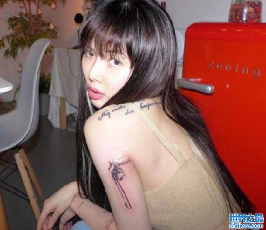 金泫雅还在她的右耳后纹上小小的爱心非常可爱,不仅仅是英文的纹身,还有右肩上古希伯莱文寓意着信念信仰,以及拉丁语“tempus”寓意着时间。她还非常有创意地将一句话拆分开来,在她的左手肘是I'm,右手肘是special,一整句话就是“I'm special”。