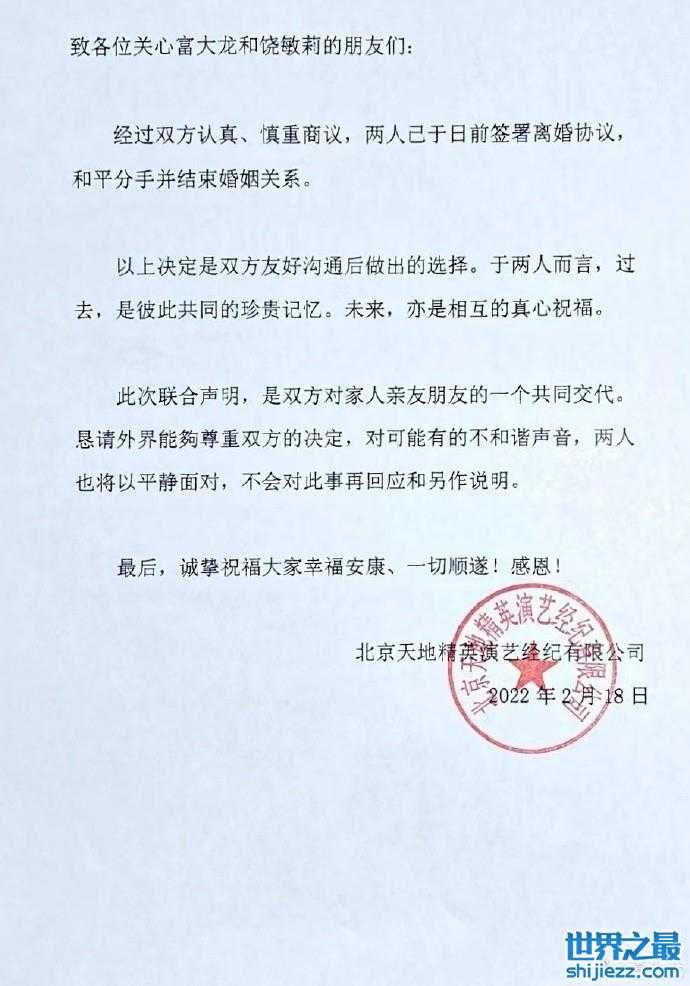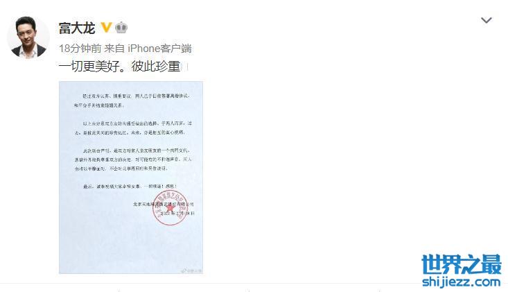 2月18日,低调的富大龙在个人账号分享发文,他表示经过双方的认真商议,两人已经于日前签署了离婚协议,并且和平分手结束掉婚姻关系。