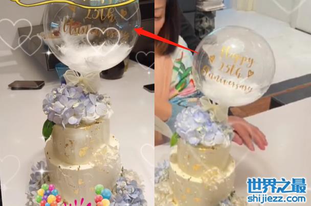 今年是黎耀祥夫妻二人25周年的结婚纪念日,所以蛋糕的气球上写着“Happy 25th Anniversary”的字样,气球的顶部和底部周围都用花瓣装饰,显得非常精美。