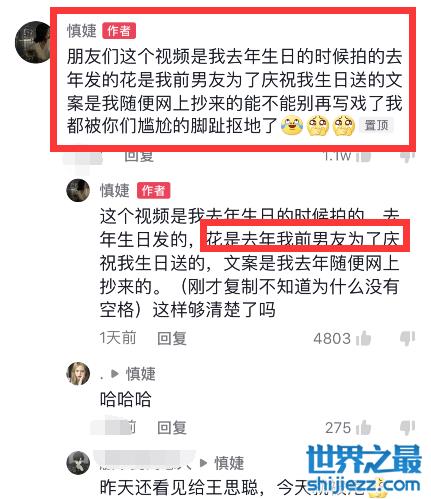 后来,慎婕主动发文澄清,否认网上所谓“痴恋”王思聪的说法,说这个视频是她过生日的时候,前男友送的玫瑰花,文案是网上随便抄来用的,让网友别再写戏了,都要尴尬到脚趾抠地了。