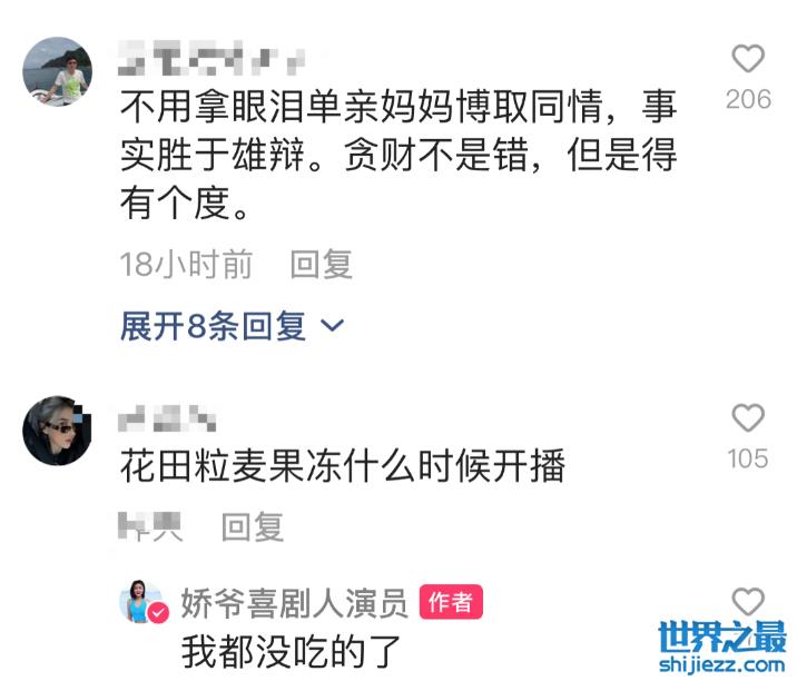 看到娇娇的这段视频,网友认为她是在拿单亲妈妈博取同情,贪财不是错,但要有个度。有网友问她什么时候开播,她说自己都没得吃了,除了单亲妈妈的人设外,娇娇还有点哭穷吧。