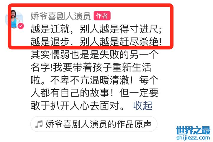 事后,娇娇又非常不服的晒出一条视频,并配文:“越是迁就,别人越是得寸进尺;越是退步,别人越是赶尽杀绝! 其实懦弱也是失败的另一个名字!我要带着孩子重新生活啦。不卑不亢温暖清澈!每个人都有自己的故事!但一定要敢于扒开人心去面对。”